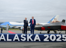 ANCHORAGE, ALASKA — August 15, 2025 — A U.S. B-2 Spirit bomber, accompanied by four F-35 fighter jets, soared over Anchorage today ahead of a high-stakes meeting between