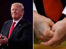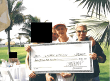 A photo in a Jeffrey Epstein scrapbook released Monday shows Epstein holding a novelty check signed “DJ Trump” with a handwritten caption suggesting Epstein “sold” a woman to