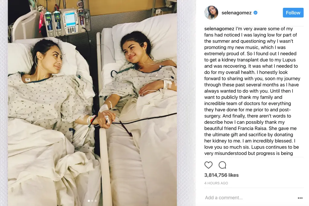 The kidney transplant took place in 2017 as part of Selena Gomez’s treatment for lupus. At the time, the then-33-year-old singer posted hospital photos on Instagram of herself and Francia Raisa holding hands, thanking Raisa for “the ultimate gift” of donating a kidney and calling her a blessing and a beloved “sis.”